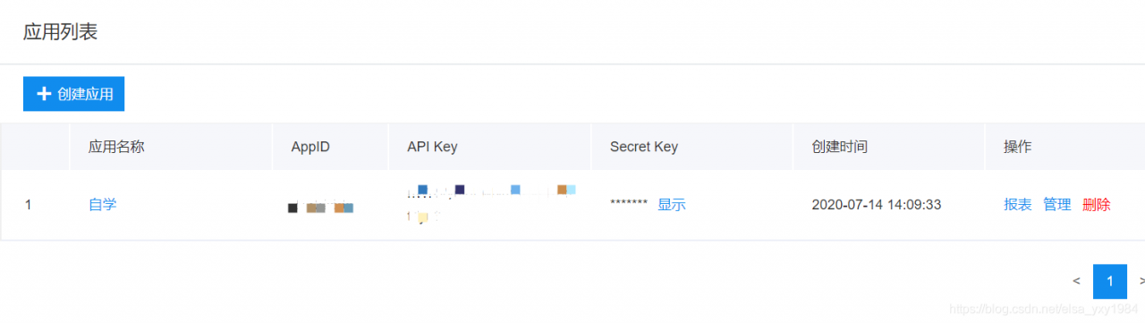 6、 在应用列表内,可以看到一条记录(刚创建的)。列表内容见下图(AppID,APIKey,SecretKEy这些要留存)