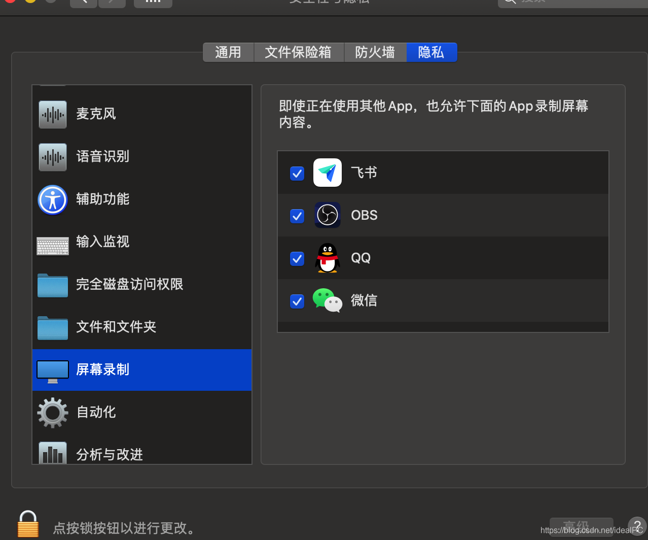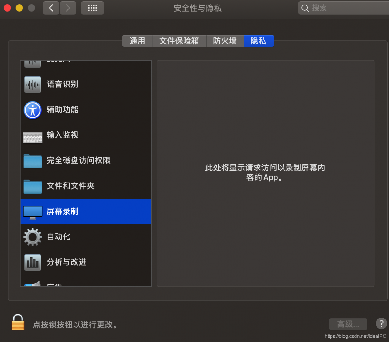 安装软件需要获取截屏和屏幕录制的功能权限,但发现打开系统设置->安全性与隐私-屏幕录制,右边竟然没有可勾选或可添加的App选项