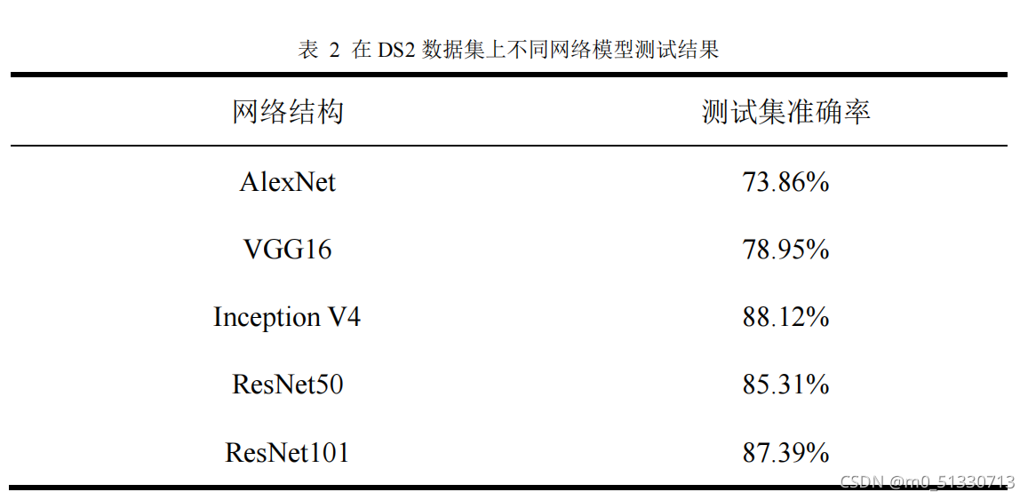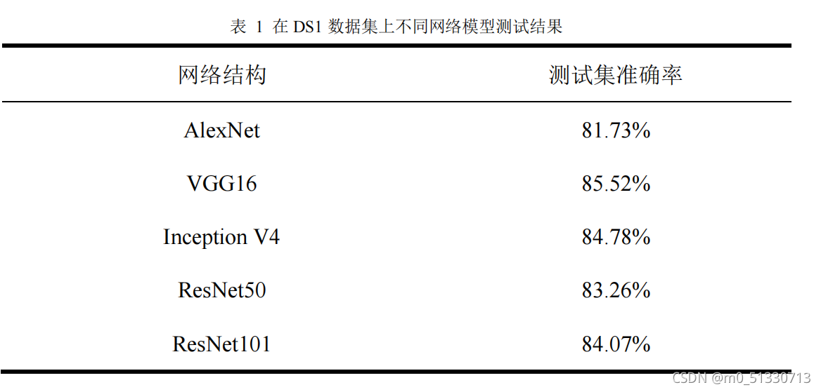 为对比不同的模型结构在不同数据集上的分类效果,选取 AlexNet 、 VGG16 、Inception V4 、 ResNet50 、 ResNet101 等不同网络模型在数据集 DS1 和 DS2 上测试准确率。