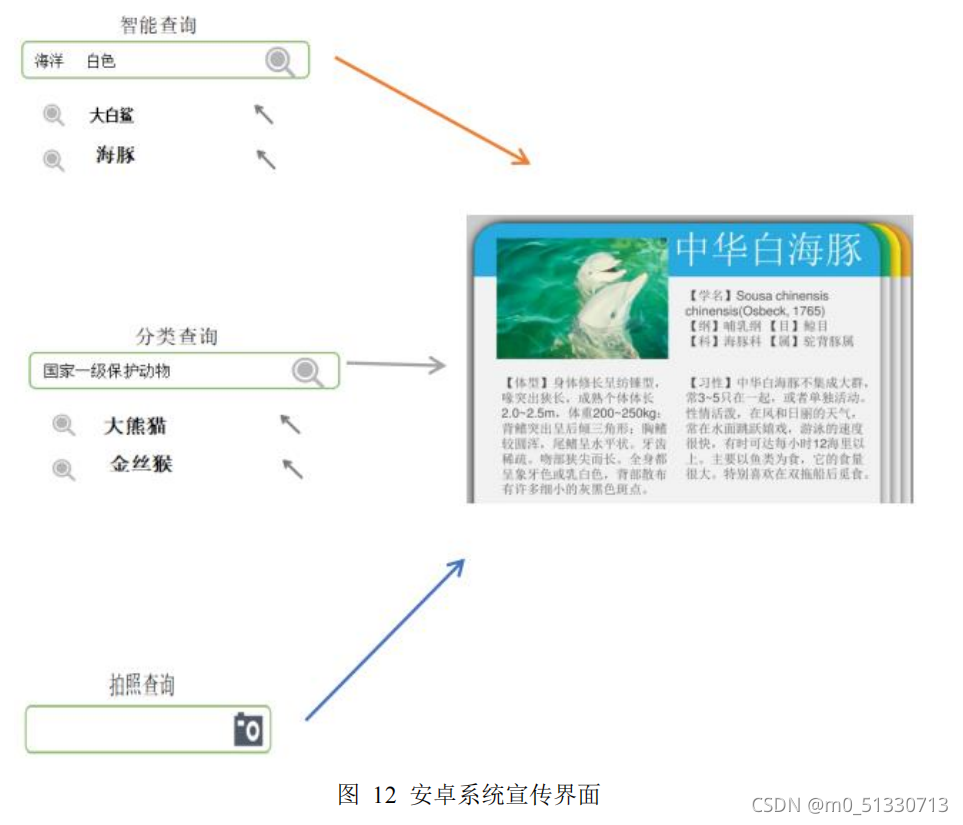 对于手机系统而言,首先要对产品进行 UI 框架的搭建,在百度 AI 基于 IDL大规模图像训练基础上,然后,通过网络爬虫广泛收集数据,最后,利用 EasyDL 实现定制化高精度 AI 模型,提供拍照识别功能对动物和部分野生动物进行有效 识别。同时,还可以自动搜索并展示出识别到的动物的信息,达到便携性、实用 性和普及性的目的,从而满足不同人群的不同需求。