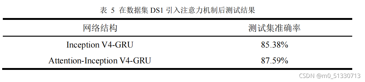 随后,选用相同的深度卷积神经网络 Inception V4 和结构相同的 GRU 模型,加入注意力机制后,对比分析其准确率的影响从表 5 中可以看出,通过注意力机制的引入,对分类的准确率有着显著提升,比未加入注意力的分类模型准确率提高 2.21% 。