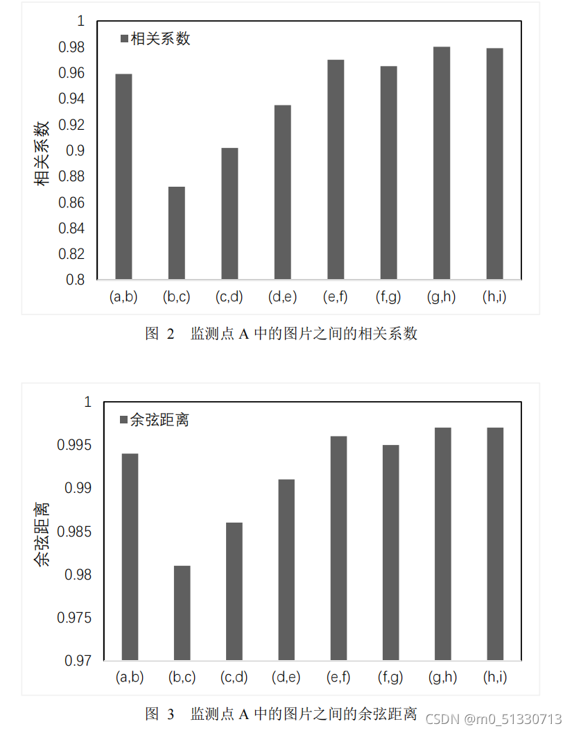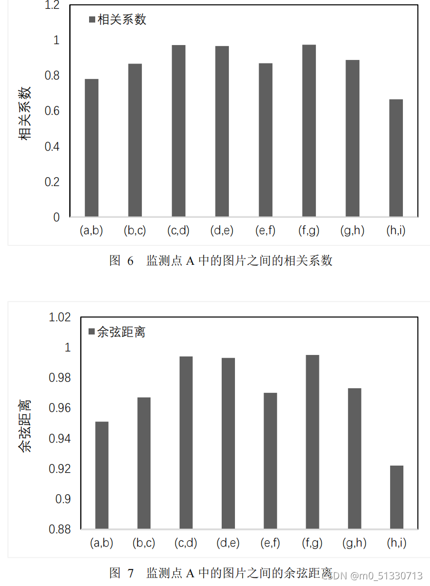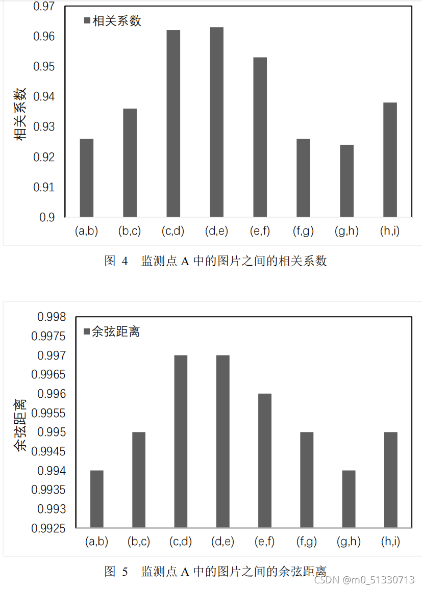 从图 1 和图 2 可知,图片( b )和图片( c )相关性最低,图片( g )和图片( h ) 相关性最高,它们之间自相关系数的最大差值为 0.108068 ,余弦距离,最大差值 为 0.0157317 。相邻图片间自相关系数与余弦距离变化波动较小,且相邻图片间相 关系数均大于 0.87 ,余弦相似度均大于 0.98 。因此,该序列图片彼此之间在时序方面体现出强相关的特性。