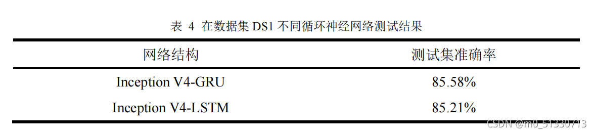 其次,选用相同的神经网络 Inception V4 ,对不同的循环网络结构模型的性能