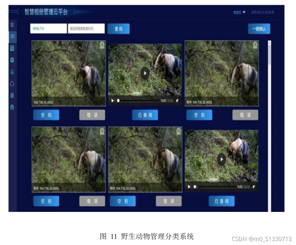 该系统可以对红外出发相机传输回来的图像进行监测管理,实时收集物种监测与识别系统传输的物种类型、 数量、发生时间、位置信息等,进行数据的二次编辑与确认,以保证其准确性,为分析保护地的物种种群结构、数量变化提供数 据支撑,并结合区域环境监测因子数据,研究环境变化对其影响。对处理成功的 图像信息,通过识别次数、未识别、已识别及已识别精准度分类统计,分物种及 时间梯度来分析物种自动化观测系统的运行效率;同时基于识别的数量分析保护 地的网格粗密度、多样性指数等,生成物种观测分析报告。