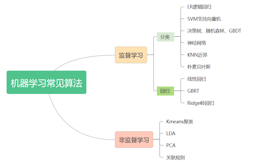 监督学习:包含分类和回归两大类。常见的算法有LR、树算法、神经网络和GBRT等,其中