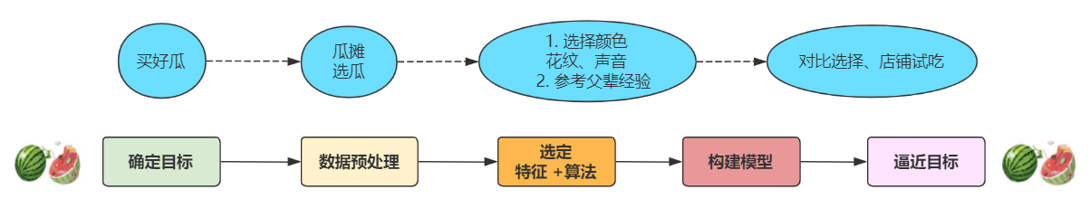 先确定一个预期目标(买到好瓜)和选瓜环境(村东头);其次总结选瓜方法(父辈经验)和选瓜特征(颜色、瓜蒂等);最后根据这套方法论 + 实战,货比三家,对比得到了最好的预期结果(一个好瓜)。