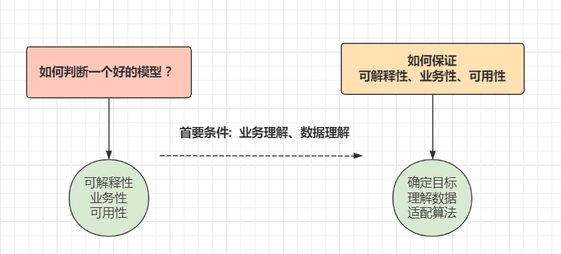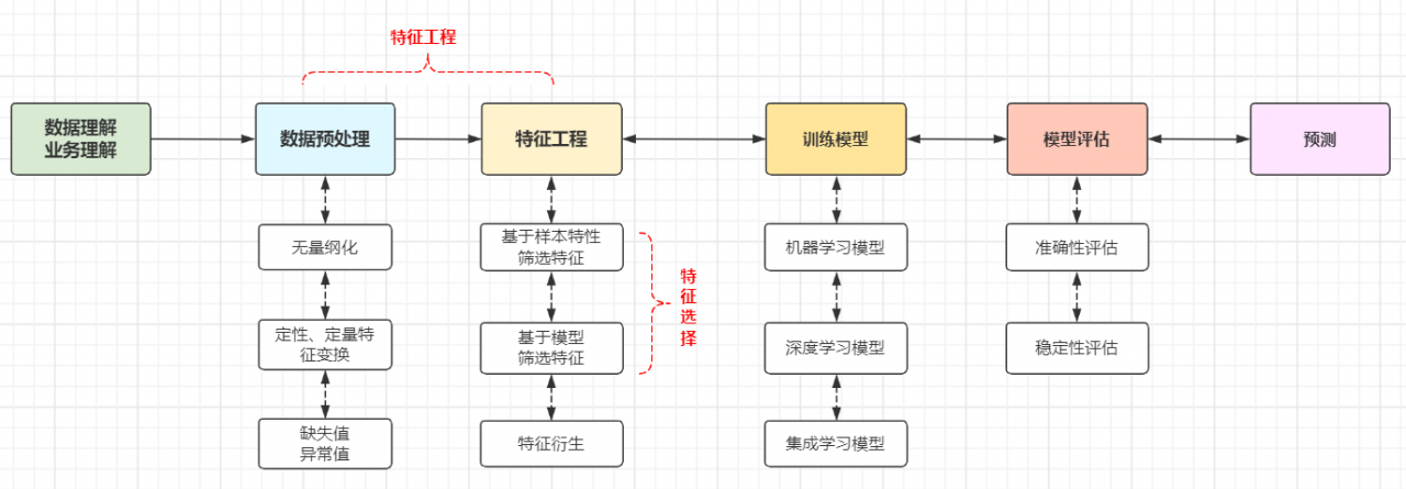 在理解业务背景、数据含义的基础上确定预期目标;数据预处理后,选择合适的算法和数据特征并构建模型,训练最好的模型帮助我们最大化逼近(预测)预期目标。