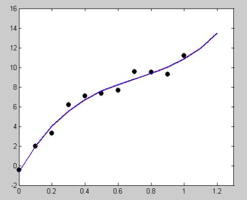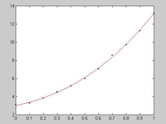 注:在针对只有一些已测数据而不太清楚最小乘二拟合函数时,采取先打印出已知数据的散点图,然后观察散点图大概分布趋向,再确定拟合函数,也可以确定多个,最后比较残差选择最优最小乘二拟合函数,再者初始值的给定也很重要。