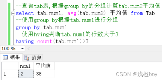 下面介绍一下HAVING子句,HAVING子句通常与GROUP BY子句一起使用,根据HAVING子句的条件过滤掉不需要的分组,在HAVING子句中因为前面使用了GROUP BY子句形成了一个组,在判断条件时不能使用列名进行判断,所以需要用指定的条件聚合函数才可以进行判断,即使这个聚合函数在后面的查询结果没有出现,下面举一个例子