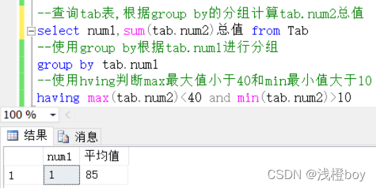 查询1组和2组分别的总值,但是只需要查询组最大值小于40和最小值大于10的组