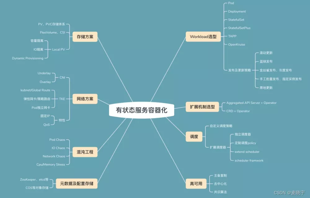 下方是我用思维导图系统性的梳理了容器化有状态的服务的技术难点,接下来我分别从以上几个方面为你阐述容器化的解决方案。