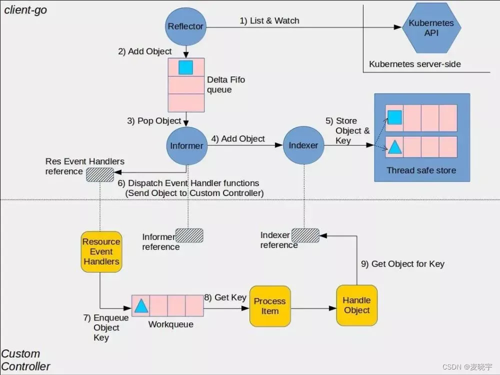 operator开发者可通过 Informer 组件注册 Add、Update、Delete 事件的回调函数。Informer 组件收到事件后会回调业务函数,比如典型的控制器使用场景,一般是将各个事件添加到 WorkQueue 中,operator 的各个协调 goroutine 从队列取出消息,解析 key,通过 key 从 Informer 机制维护的本地 Cache 中读取数据。
