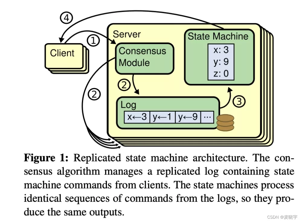 答案就是 raft/paxos 共识算法,它最早是基于复制状态机背景下提出来的,由共识模块、日志模块、状态机组成, 如下图(引用自 Raft 论文)。通过共识模块保证各个节点日志的一致性,然后各个节点基于同样的日志、顺序执行指令,最终各个复制状态机的结果是一致性的。这里我以 raft 算法为例,它由 leader 选举、日志复制、安全性组成,leader 节点故障后,follower 节点可快速发起新的 leader 选举,并确保数据安全性,follwer 节点故障后,只要多数节点存活,就不影响集群整体可用性。