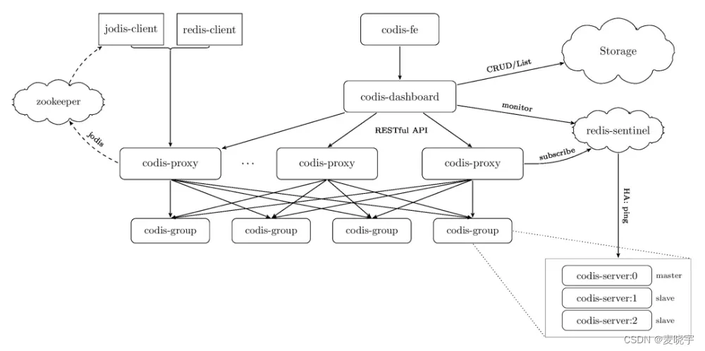 下图是 Redis 集群解决方案 codis 的整体架构图(引用自 Codis项目[1])。