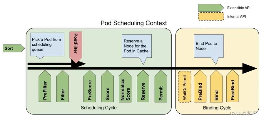 最后 Kubernetes 在1.15版本中推出了一个新的调度器扩展框架,它在调度器的核心流程前后都增加了 hook。选择待调度 Pod,支持自定义排队算法,筛选流程提供了 PreFilter 和 Filter 接口,评分流程增加了 PreScore,Score,NormalizeScore 等接口,绑定流程提供 PreBind 和 Bind,PostBind 三个接口。基于新的调度器扩展框架,业务可更加精细化、低成本的控制调度策略,自定义调度策略更加简单、高效。