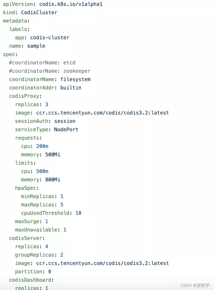 在我们上文的 codis 集群案例中,就可以选择通过 Kubernetes 的 CRD 扩展机制,自定义一个 CRD 资源来描述一个完整的 codis 集群,如下图所示。