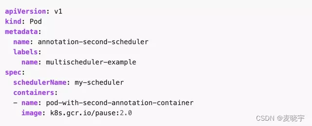 接着你可以基于 Kubernetes 的调度器实现自己独立的调度器,部署独立的调度器到集群后,你只需要通过将 Pod的 schedulerName 声明为你独立的调度器即可。