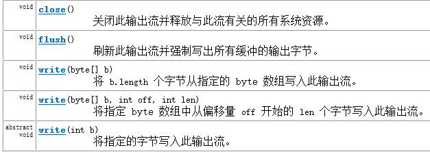 OutputStream此抽象类,是表示输出字节流的所有类的超类。操作的数据都是字节,定义了输出字节流的基本共性功能方法。输出流中定义都是写write方法,如下图: