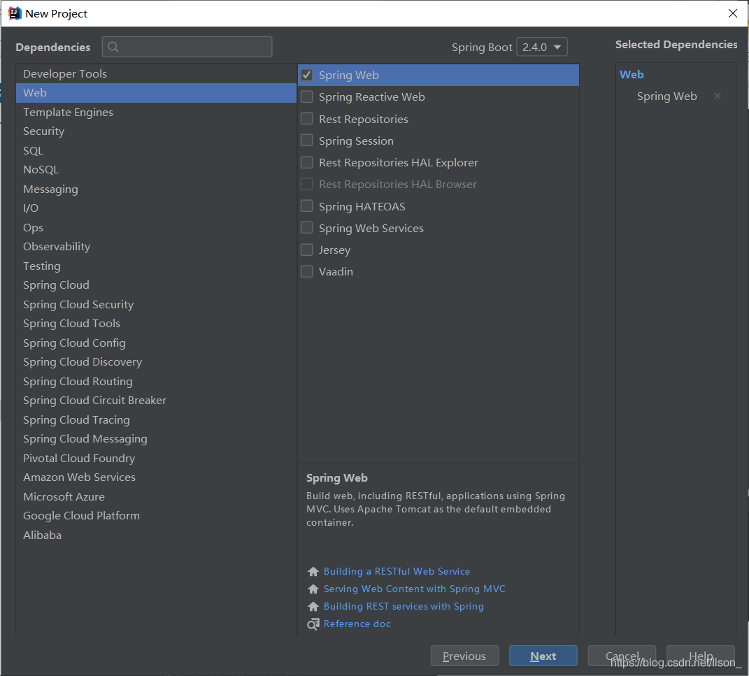 在打开 的窗口中左边的Dependencies找到Web项,需要选择 Spring Web,然后就直接Next了,最后修改下工程保存的路径,点击Finish结束工程创建。