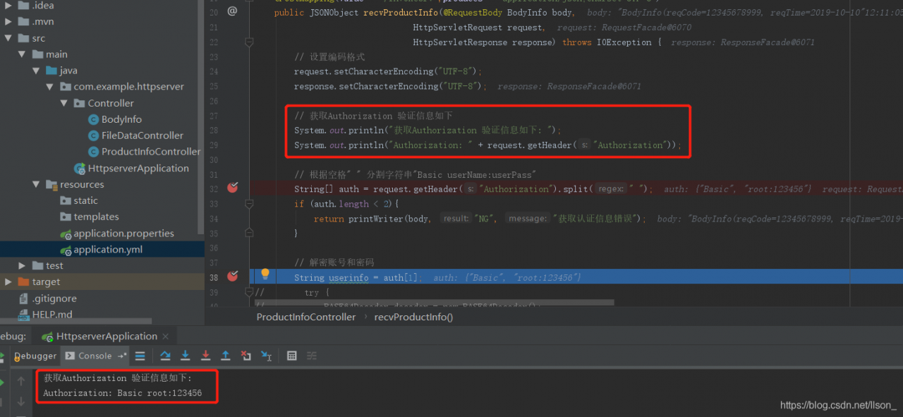以下就是Http服务器接收Post请求后的处理操作,请注意Post请求头是带有Authorization信息的,里边包含了用户名跟密码 Base64(userName:password),其中用户名跟密码是可以有Base64加密的,所以在接收到Post请求后需要解码Base64(已注释),实际上我是需要Base64加密解密的但是这里做测试就不带上了,值得注意一下@RequestMapping是相当于这个类接口的起始地址,而每个接口前面的@PostMapping相当于每个函数的接口起始地址,所以如果类前面有@RequestMapping的话那就表明你们村就在那看你想去访问哪一户人家了: