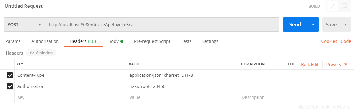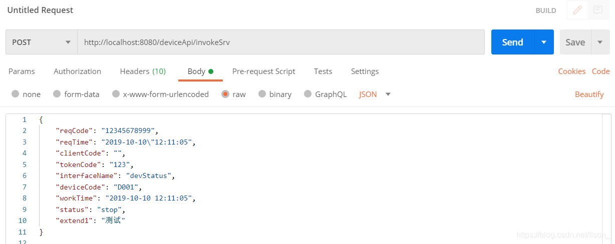 使用Postman测试一下,其中http://localhost:8080/deviceApi/invokeSrv,localhost:8080表示你本机的IP与服务器默认端口号,/deviceApi表示这个类的起始地址,/invokeSrv表示类函数的起始地址: