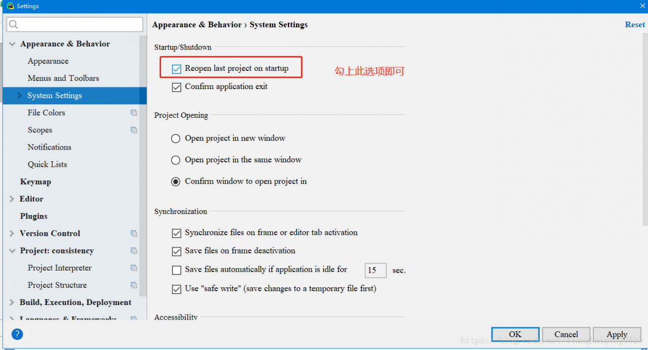 Pycharm如何选择自动打开或不打开最近项目file--settings--Appearance&Behavior--System Settings不想打开取消即可。版权声明:本文为liangkaiping0525原创文章,遵循CC 4.0 BY-SA版权协议,转载请附上原文出处链接和本声明。原文链接:https://blog.csdn.net/liangkaiping0525/article/details/81408372