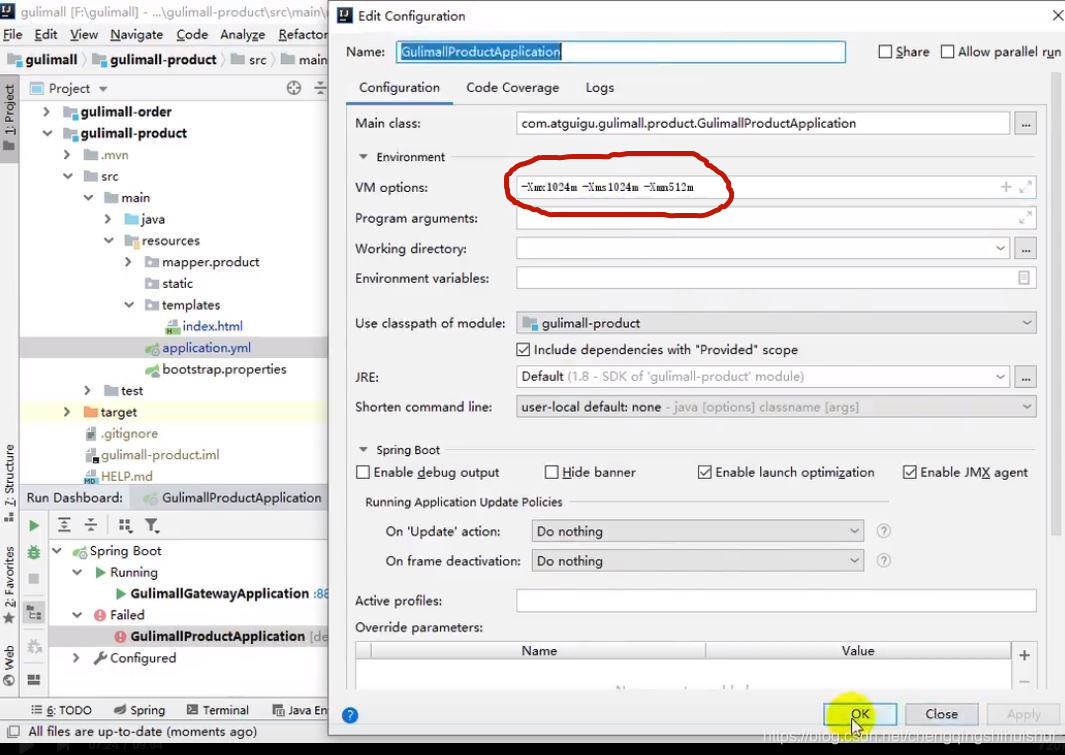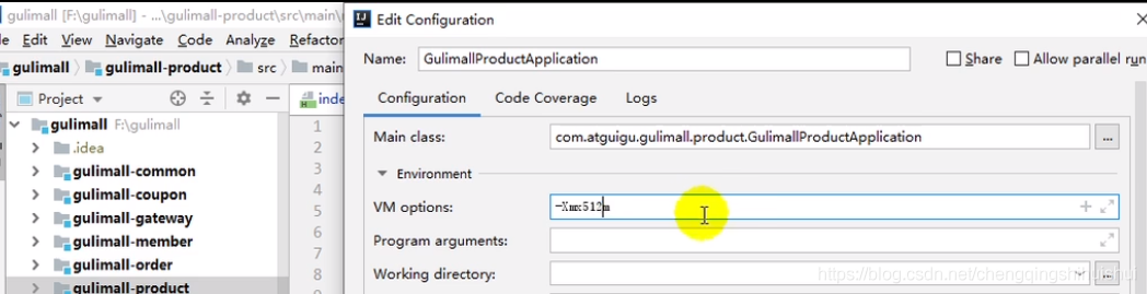 进入微服务的 Configuration(如下图所示),在红圈处设置各项JVM内存