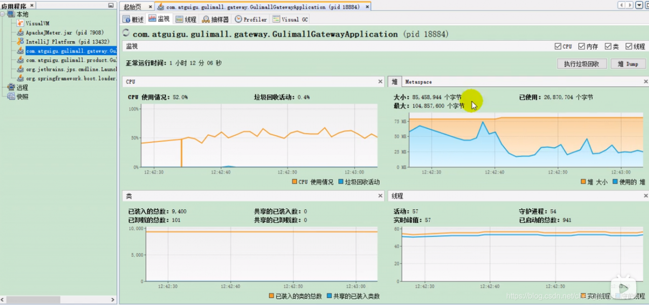 可监控本地和远程应用(远程应用需要配置,一般不用),主要用于监控内存泄露,跟踪垃圾回收,执行时内存、cpu 分析,线程分析