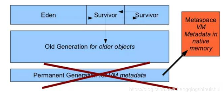 (3)从 Java8 开始,HotSpot 已经完全将永久代(Permanent Generation)移除,取而代之的是一 个新的区域—元空间(MetaSpace)