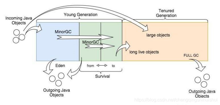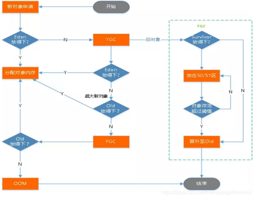 类新建的对象,先放在伊甸园区(Eden),如果伊甸园区放得下,就直接分配内存,放不下,就做一次YGC(简单内存回收,耗费资源少,速度快)... ...具体过程见如下流程图: