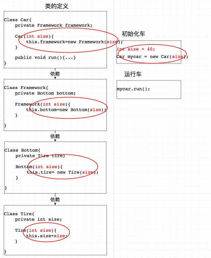 由此我们可以看到,仅仅是为了修改轮胎的构造函数,这种设计却需要修改整个上层所有类的构造函数!在软件工程中,这样的设计几乎是不可维护的——在实际工程项目中,有的类可能会是几千个类的底层,如果每次修改这个类,我们都要修改所有以它作为依赖的类,那软件的维护成本就太高了。