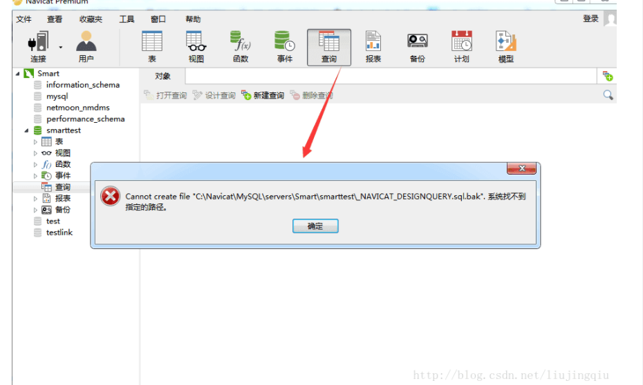 Navicat for MySQL 新建查询时,报can't create file ...系统找不到指定的文件夹出现问题...如图点击新建查询报错解决办法将这个路径修改一下就ok了转载于:https://www.cnblogs.com/perfei456/p/8576944.html