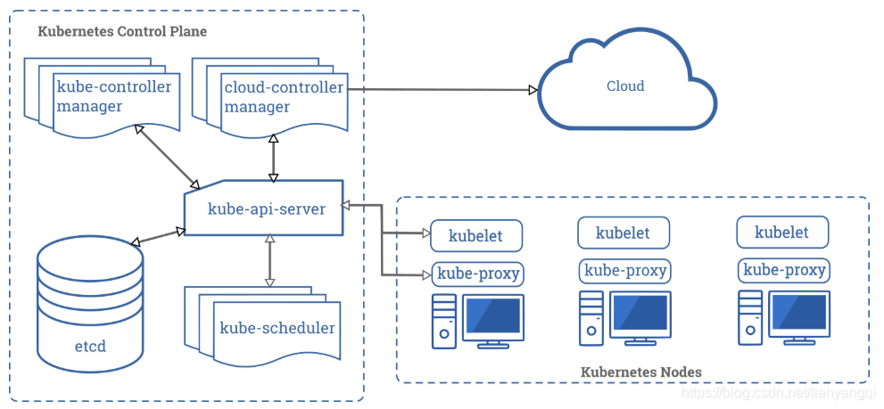 在看下kubernetes组件,集群由控制平面(control plane)和节点(nodes)组成,基本上跟众多分布式、集群应用框架或项目的风格一致,解耦、分离,用“三个臭皮匠”来胜过“一个诸葛亮”,毕竟“臭皮匠”常有,而“诸葛亮”不常有。