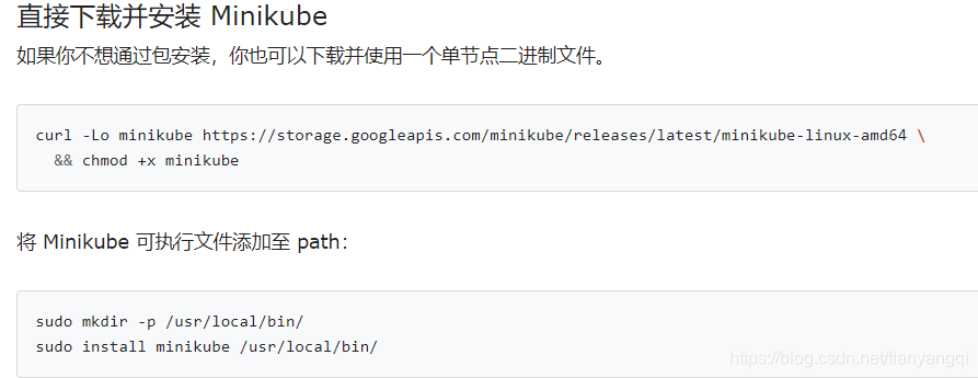 echo "source <(kubectl completion bash)" >> ~/.bashrc步骤二:安装minikube,我采用“下载并使用一个单节点二进制文件”的方式,即通过curl命令来安装,官网截图如下: