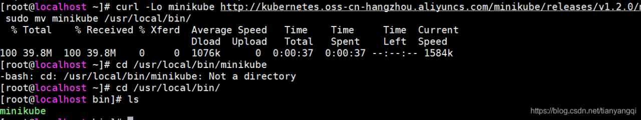 curl -Lo minikube http://kubernetes.oss-cn-hangzhou.aliyuncs.com/minikube/releases/v1.2.0/minikube-linux-amd64 && chmod +x minikube && sudo mv minikube /usr/local/bin/这条命令的作用,就是根据后面的网址将“minikube-linux-amd64”二进制文件下载到当前目录并修改名字为minikube,然后给minikube这个文件增加执行权限,最后将文件移动到/usr/local/bin/这个目录下。