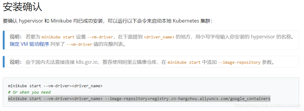 步骤四:启动minikube,因为官网切换到中文了,还温馨的附上了一个适合国内的启动命令,需要自行添加driver_name,如果“vm-driver=none”的话,说明运行在宿主机上,也适用于docker。官网截图如下: