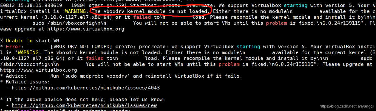 VirtualBox:这是在安装VirtualBox后,尝试启动minikube出遇到的问题,根据网上的方法,也安装了kernel和head等包,始终未能解决,放弃了……