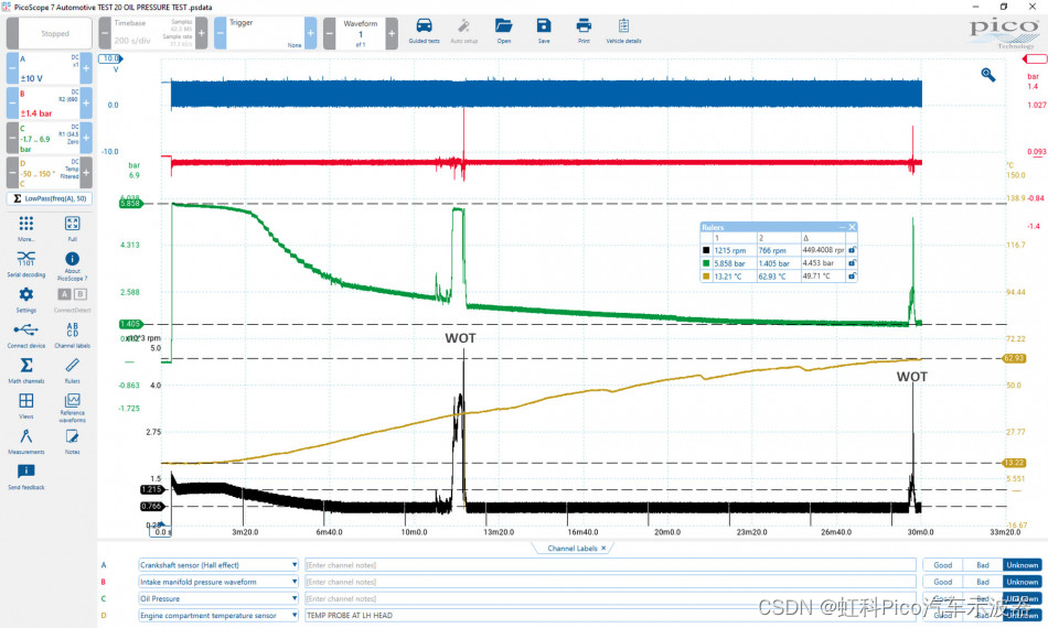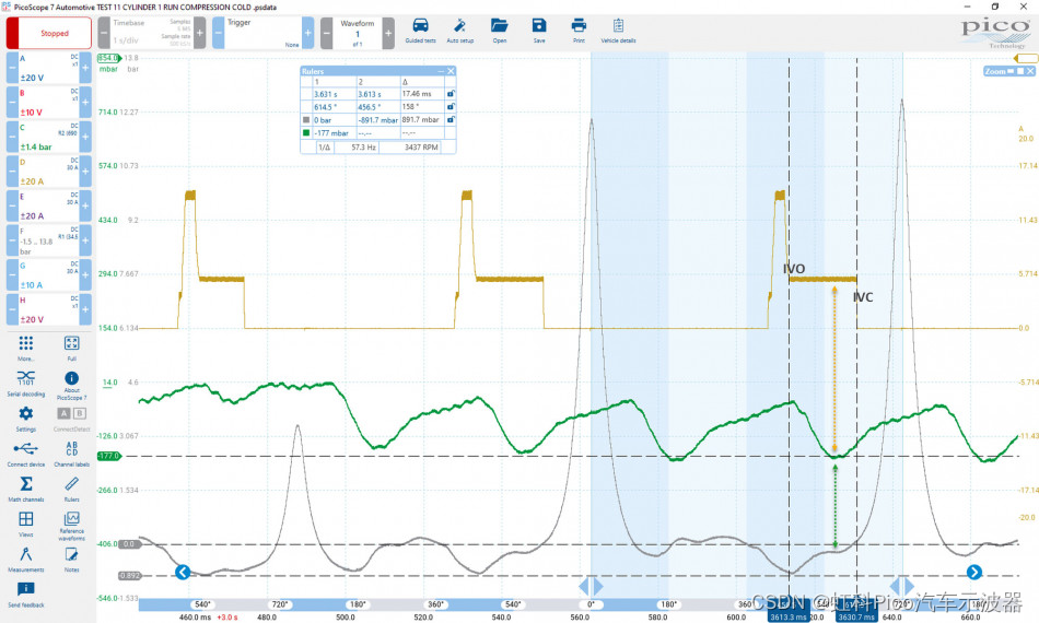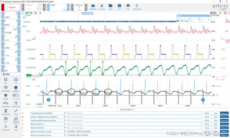 信道D与F分别显示了透过进气门执行器和汽缸一点火主电路的电流。下方的截图数据显示发动机在加热后最终如何在两个汽缸上正常运行。注意:通道G已改为测量第二缸点火线圈的初级电流。