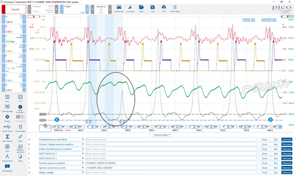 我们可以从通道C看到一缸的进气拉力(在进气岐管内感应)与二缸相比是明显不足的。