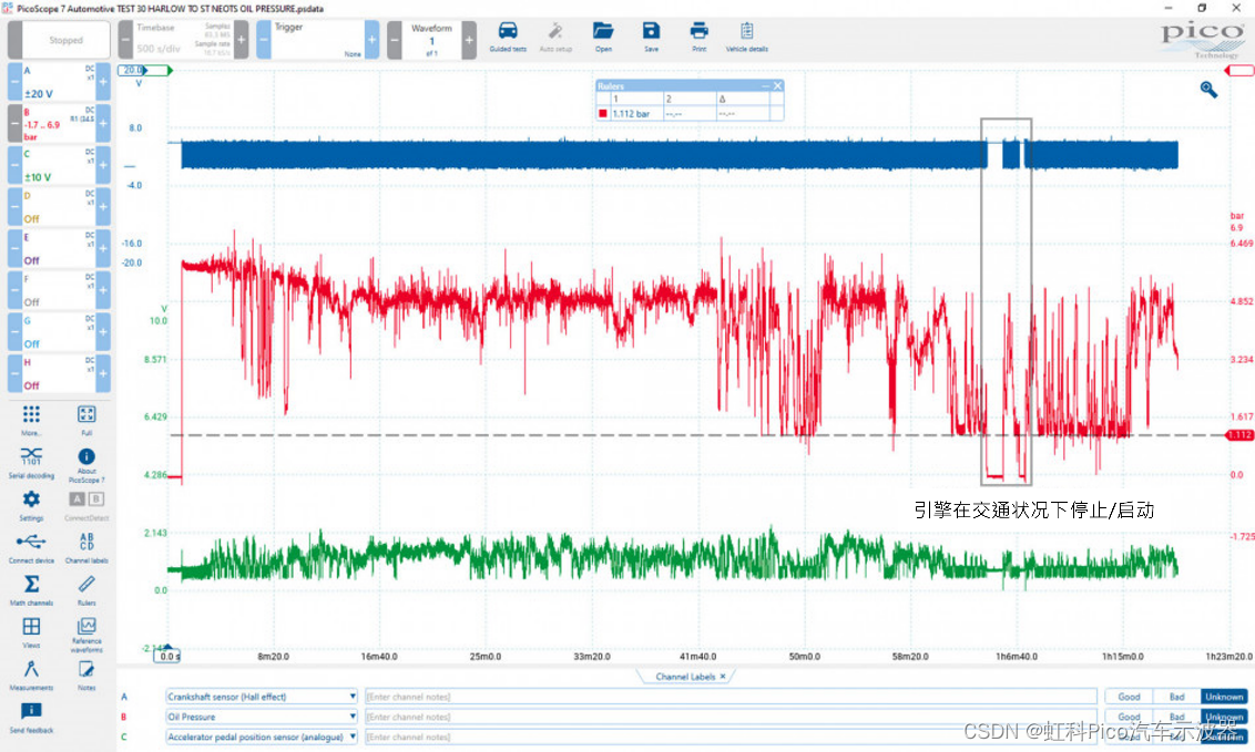 下面的数据截图显示了从Pico UK的 Harlow Essex 到 St Neots 的测量油压! 这段过程有许多负载条件,从高速高速公路驾驶到停止/启动交通以及介于两者之间的一切。 记录的最低油压为 1.112 bar。这些信息足以说服我,我们没有客户所述的油压问题。