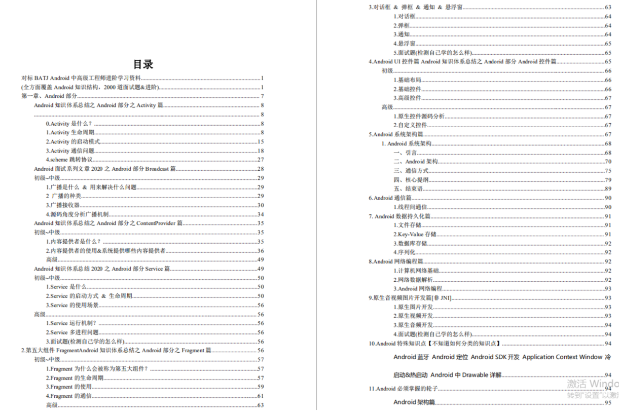 这份文档包含Android进阶架构师之路的核心知识,同时也是面试时面试官必问的知识点,篇章也是包括了很多知识点,其中包括了有Android部分、JAVA部分、Kotlin 部分、计算机网络部分、算法与数据结构部分、Flutter 等等