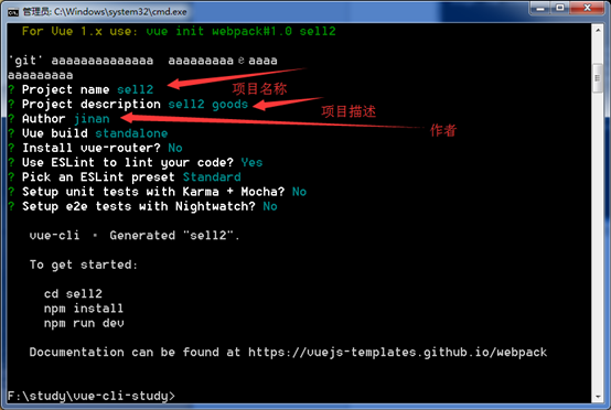 4、运行vue init webpack(注:模板名称) sell2(注:项目名称)