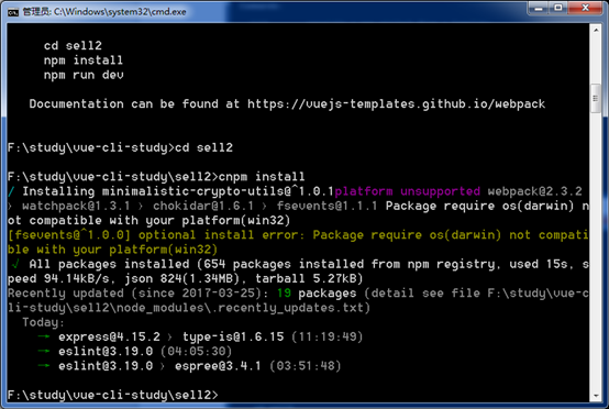 5、进入项目文件夹下执行 cnpm install 来安装下载到模板中的package.json中的依赖,安装完成后会在项目文件夹下自动生成node-module文件来存放安装的依赖文件