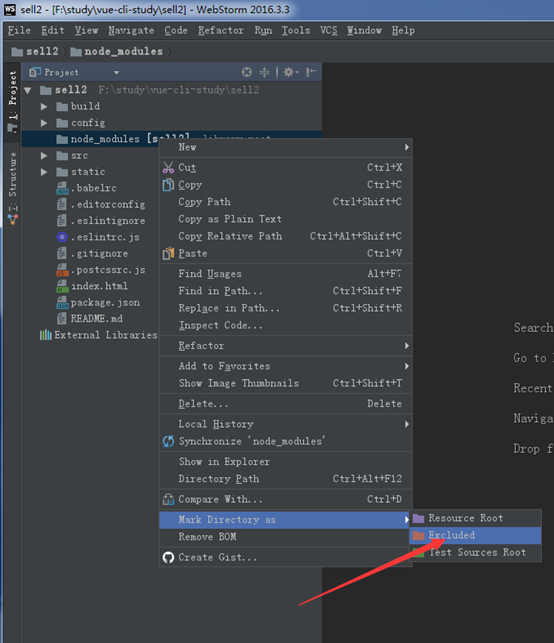 注:webstorm一打开就卡死了,没办法操作文件夹这种情况的解决方法为,首先在文件夹形式下打开删除node-modules文件夹,然后进行阻止检索的方法,然后在重新cnpm install就好*(这种方法需要安装完依赖项先运行一次然后删除node_modules子文件,webstorm打开项目,禁止检索node_ module文件夹,然后在删除该文件夹,重新安装即可)
