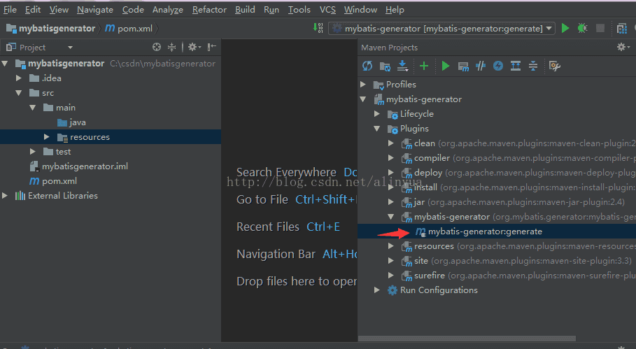 2.在pom.xml中添加mybatis-generator-maven-plugin插件,其中configurationFile根据配置文件generationConfig.xml路径自行修改