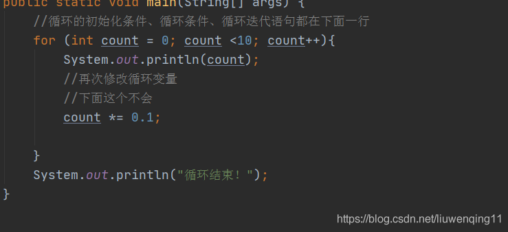与前面循环类似的是,如果循环体只有一行语句,那么循环体的花括号可以省略。下面使用for循环代替前面的while循环,代码如下。
