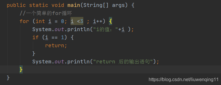 return 与continue和break不同的是,直接结束方法,不管这个return处于多少循环之中。