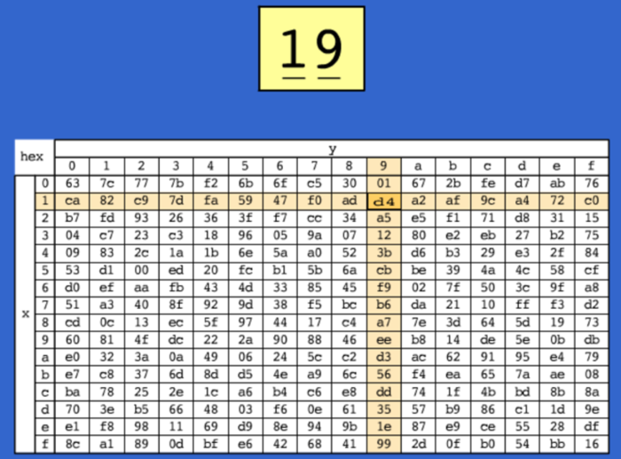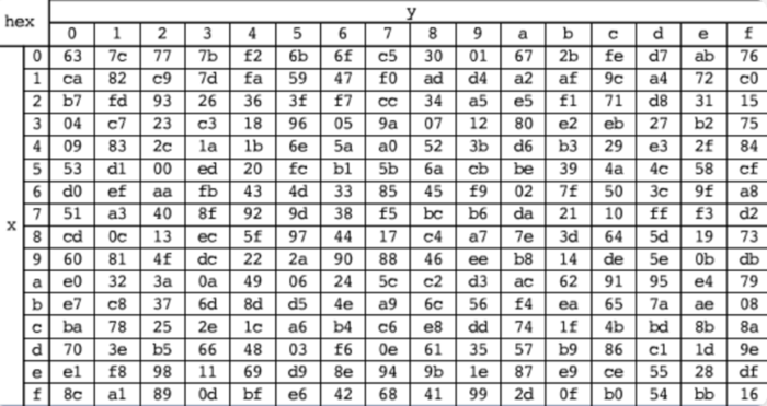 进行字节代替的时候,把状态中的每个字节分为高4位和低4位。高4位作为行值,低4位作为列值,以这些行列值作为索引从S盒的对应位置取出元素作为输出,如下图所示: