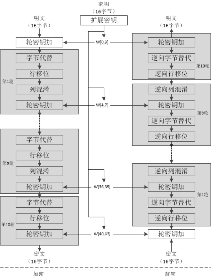 密钥扩展:将输入的密钥(16字节、24字节和32字节)进行扩展,根据密钥长度的不同,得到扩展后的密钥进行加密的轮数也不相同。