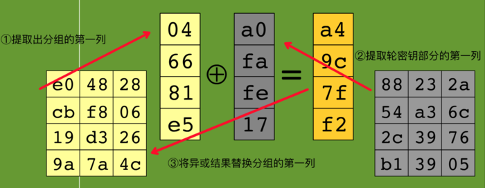 扩展密钥通过扩展密钥算法已经求出来了,所以这一步的步骤就是将分组与一部分扩展密钥按位异或操作。